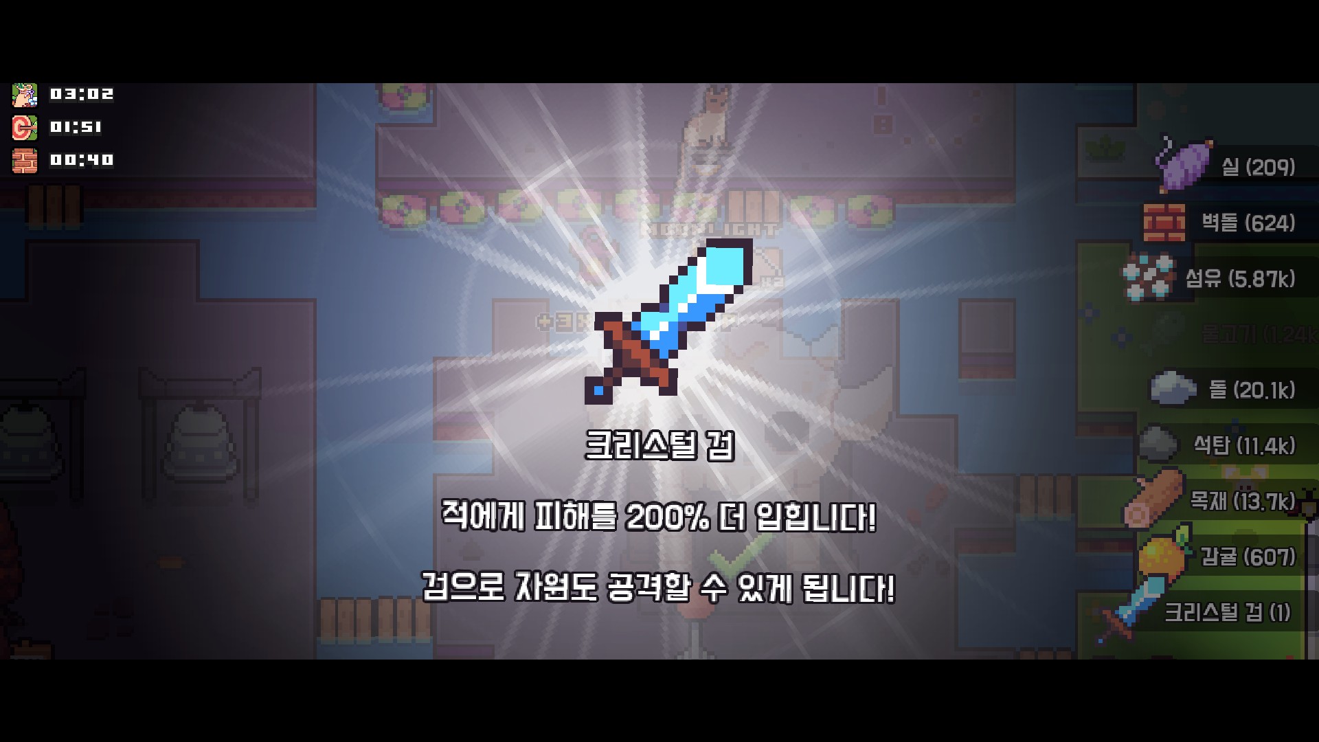 드디어 검을 크리스털 검으로 업그레이드하게 되었습니다. 이제 곡괭이와 검을 자주 바꾸지 않아도 될 것 같네요.