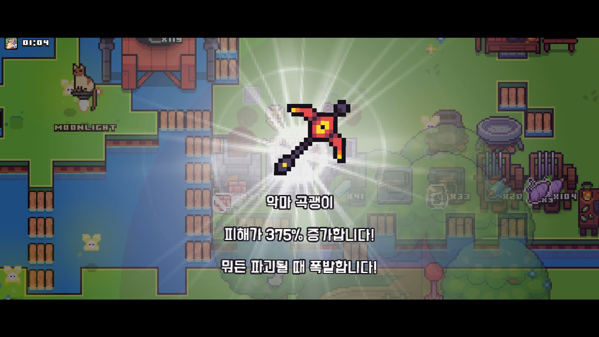 곡괭이도 드디어 악마 곡괭이로 업그레이드됐습니다. 저 파괴 효과는 폭탄과 유사하여 이제 폭탄으로 파밍 하는 일도 없어지겠네요. 파괴하고 나면 주변에 있는 자원들까지 터지며 동물도 마찬가지로 같이 파밍이 됩니다.