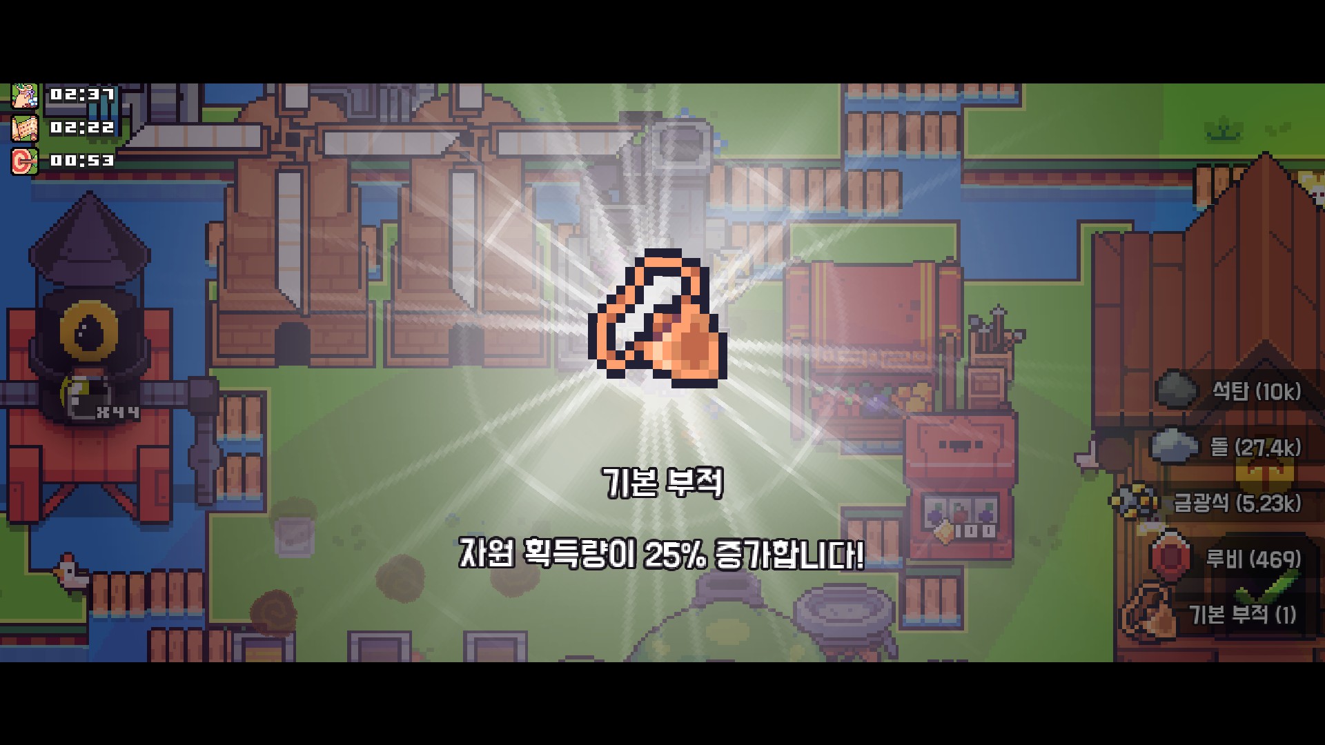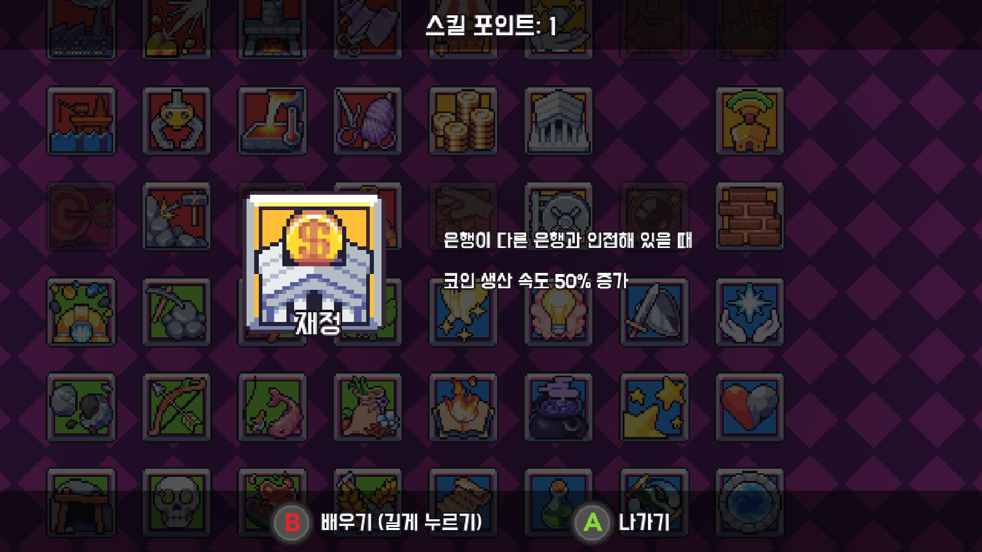 저번에 은행을 건설했었는데 이제 그 은행이 빛을 발하게 되었네요. 이제 살 땅은 없다지만 백만 코인을 소지해야 하는 업적도 있으니 그걸 깰 겸 찍어주었습니다. 참고로 은행은 자동화 스킬을 찍어도 생산된 코인이 자동으로 습득되는 것이 아닌 직접 가서 클릭을 해주어야 코인이 들어옵니다.
