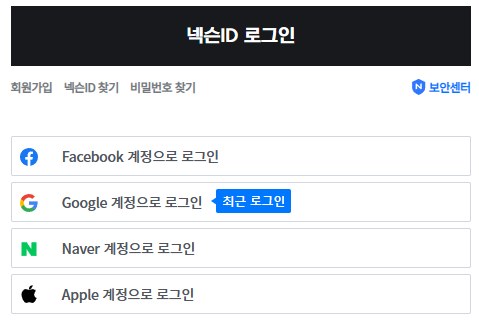 넥슨에 접속해 로그인을 하면 되는데 하단의 페이스북, 구글, 네이버, 애플 계정으로 로그인 중 폰으로 플레이하던 계정을 선택하시면 됩니다.