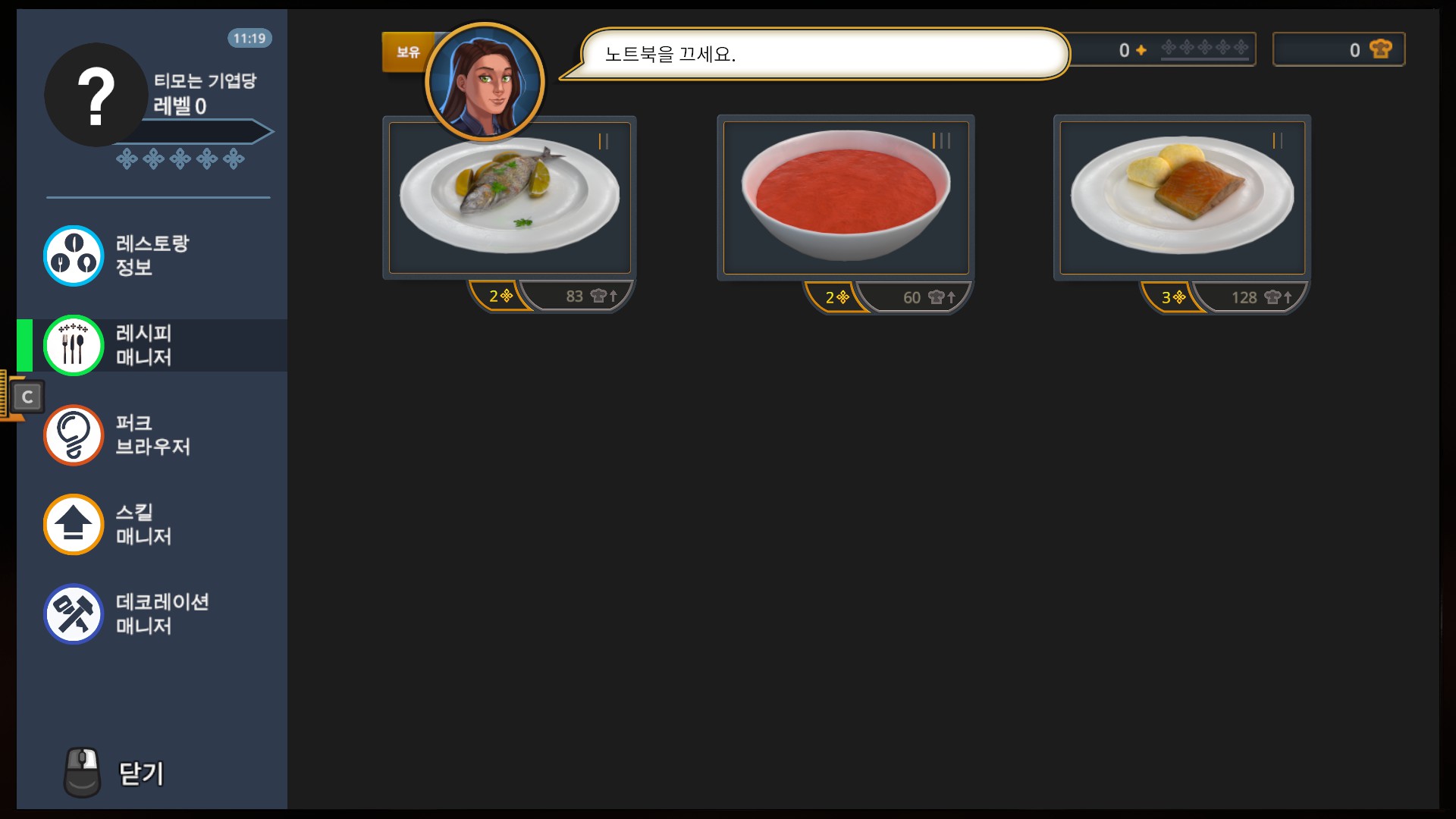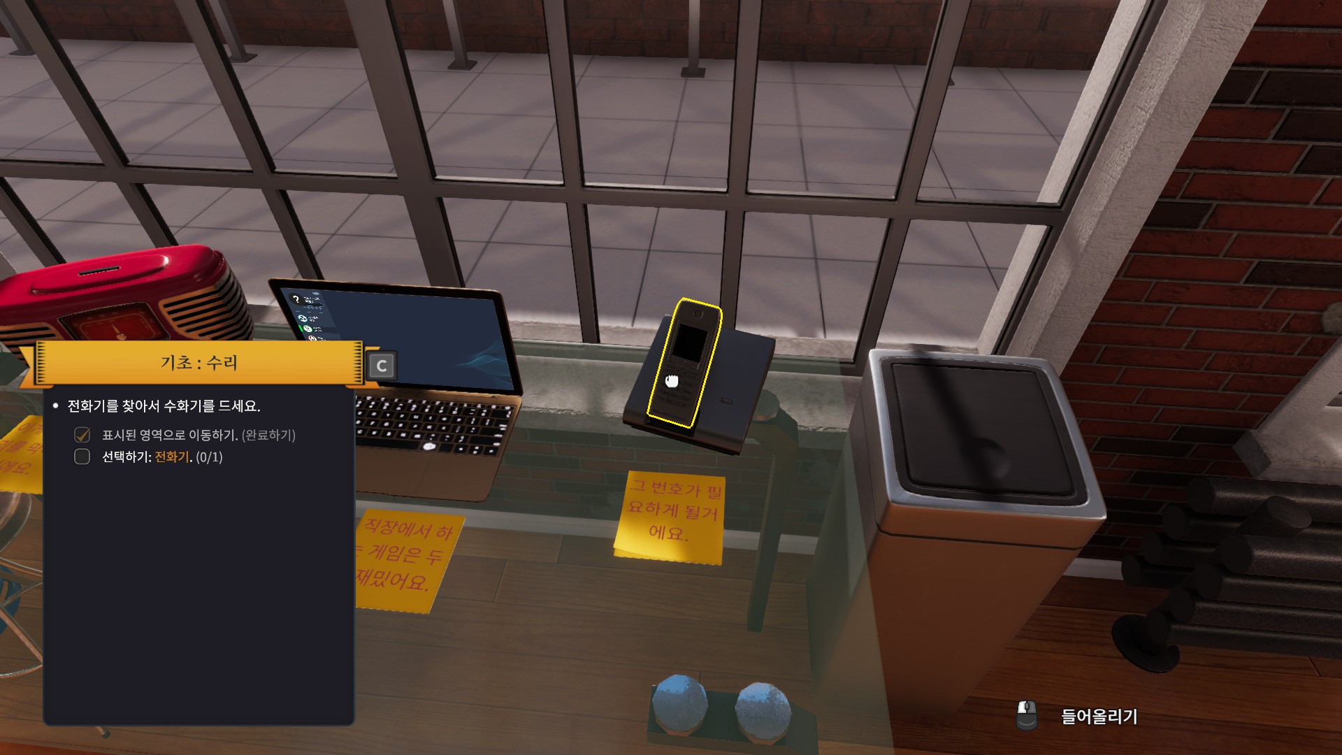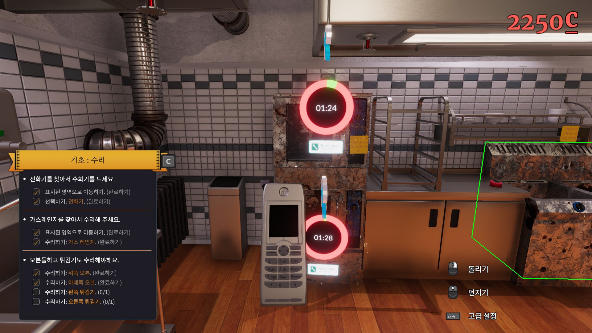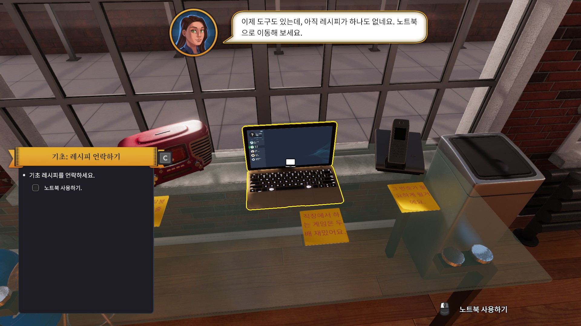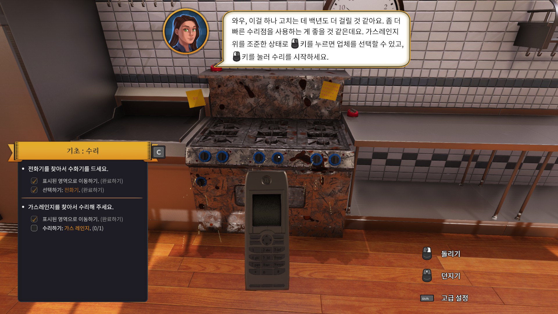 처음에 새로운게임을 누르게되면 첫날 튜토리얼을 볼지말지 선택할수있는데 처음하시는분들은 꼭 본다고 선택하시길 바랍니다. 그래서 이렇게 튜토리얼로 들어오게되면 어떤 여자가 계속 설명을 시작하는데 말풍선이 너무 빠르게 사라져 아마 읽는속도가 사라지는 속도를 따라잡지 못하실겁니다. 속독을 익히신분들이 아니라면말이죠. 일단 본론으로 돌아와 튜토리얼에서 제일먼저 시키는 일은 바로 전에 마지막으로 일했던 주방장이 조져놓은 주방을 고치는 일입니다. 그러려면 저 전화기가 필요하다고 합니다.