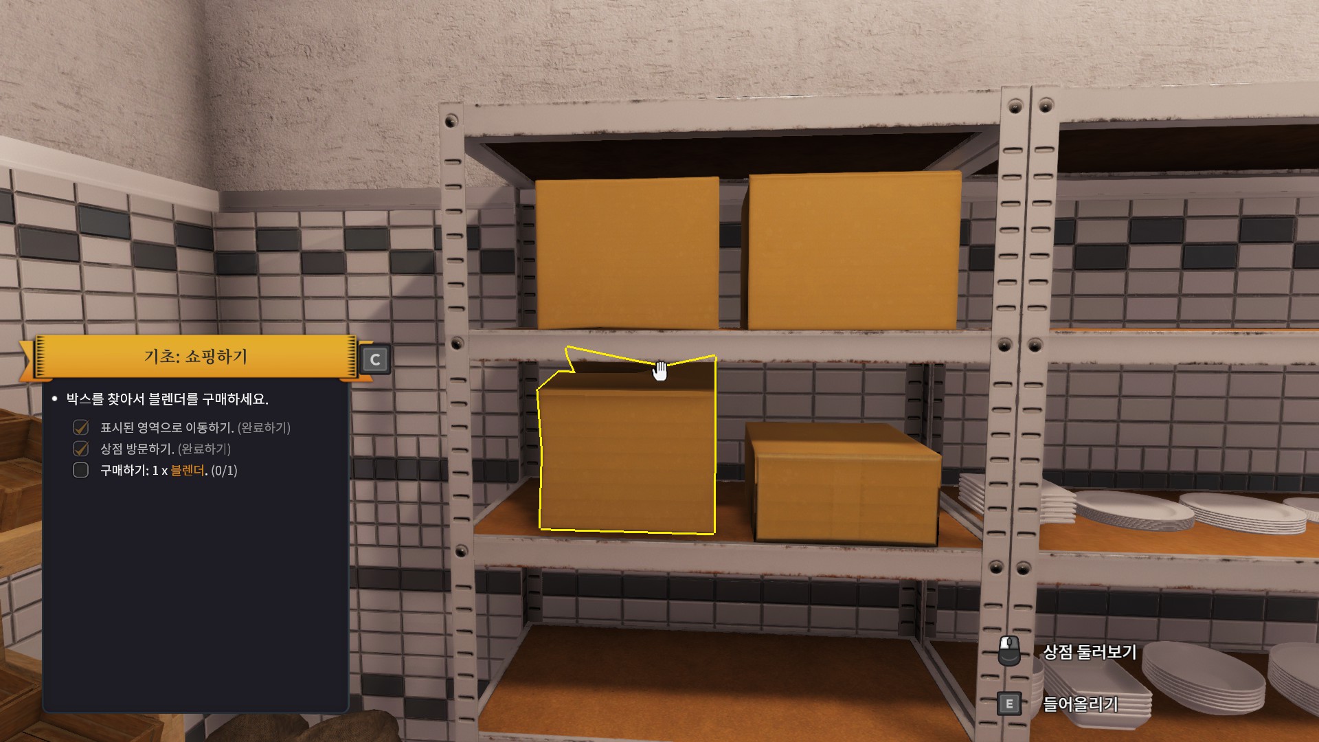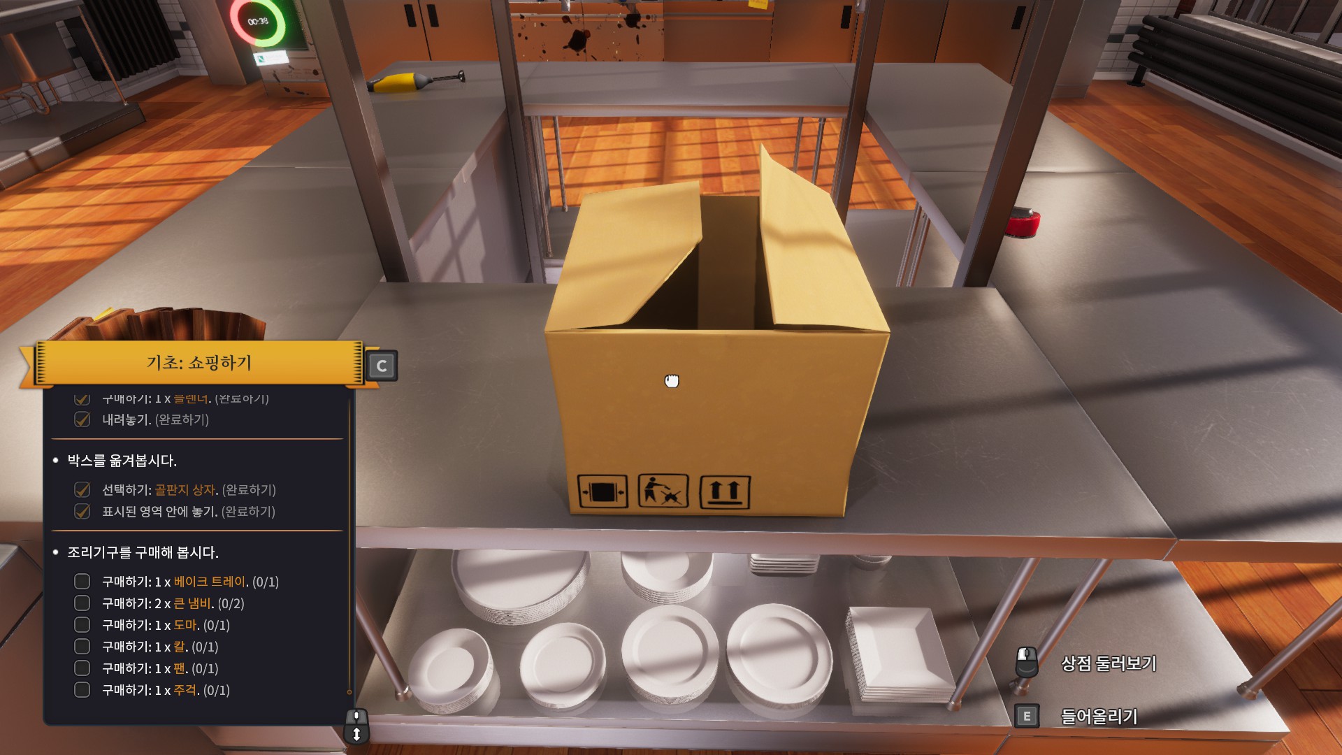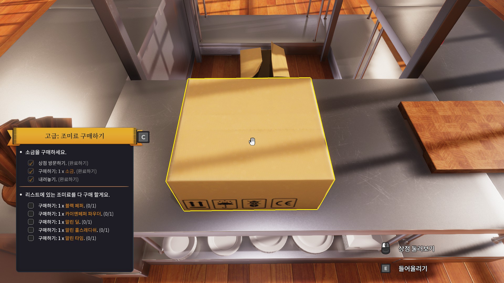 사고나면 좀 더 편하게 쓰라며 이렇게 주방쪽으로 옮기라는 퀘스트를 줍니다. 상자를 바라보며 e버튼을 누르면 되니 난이도는 아주 쉽습니다. 그리고 나면 왼쪽 아래에 보이는 리스트에 있는 기구들을 모두 구입하라는데 뭔놈의 주방에 이런 기본적인것도없는건지 이거 제가 봤을때는 전에 일하던 주방장놈이 가지고 튄거같습니다.