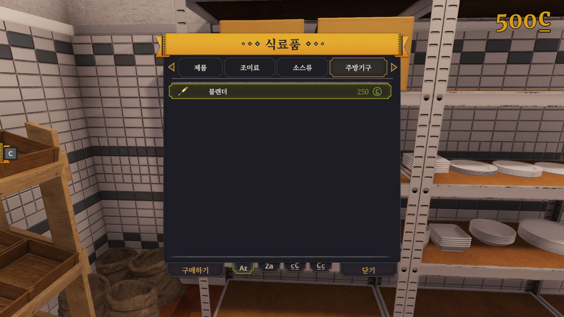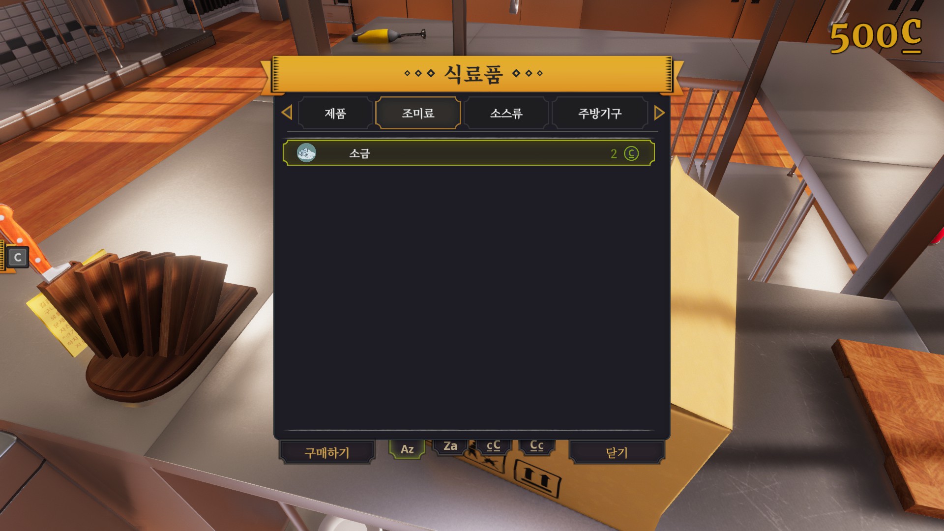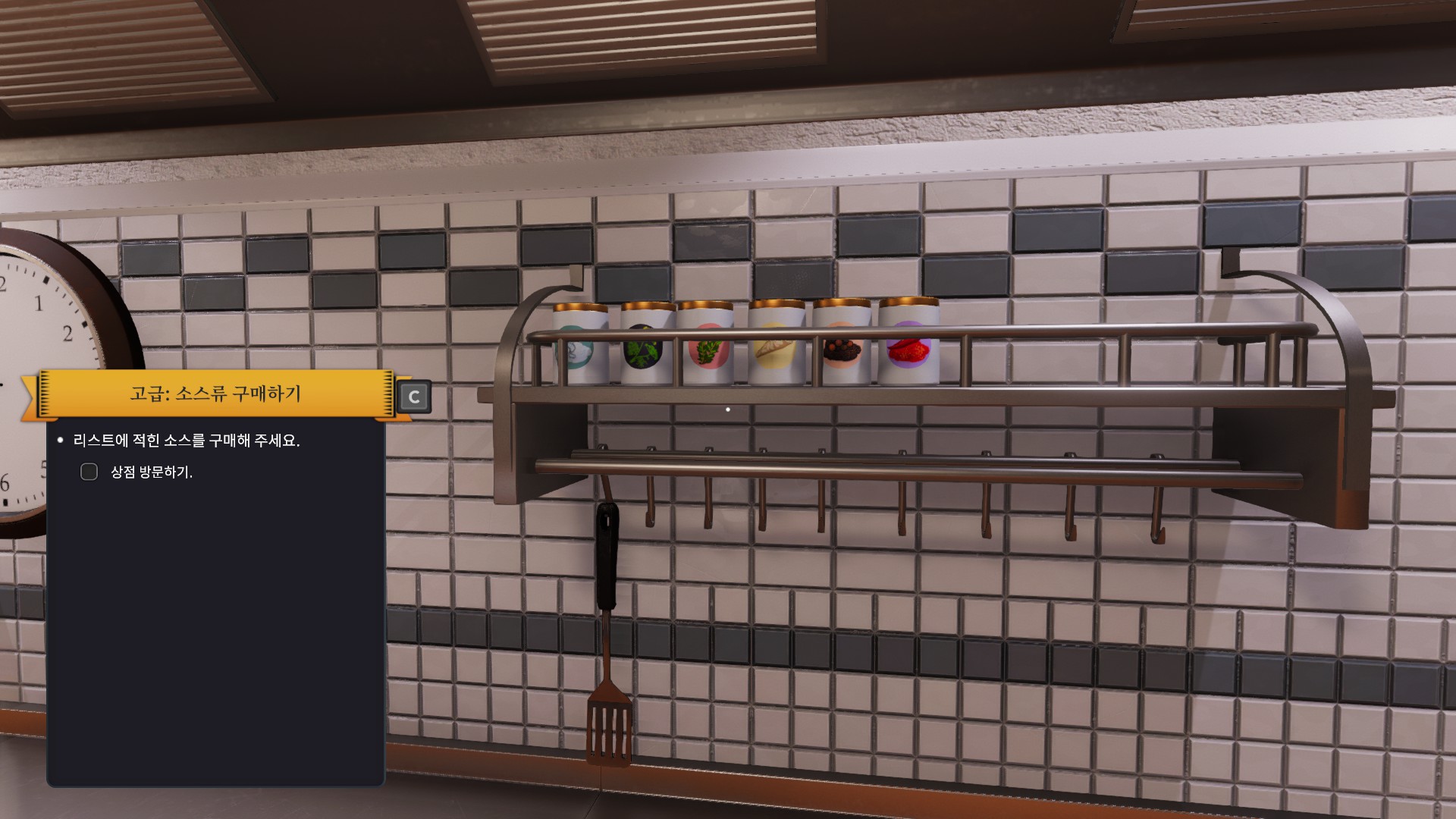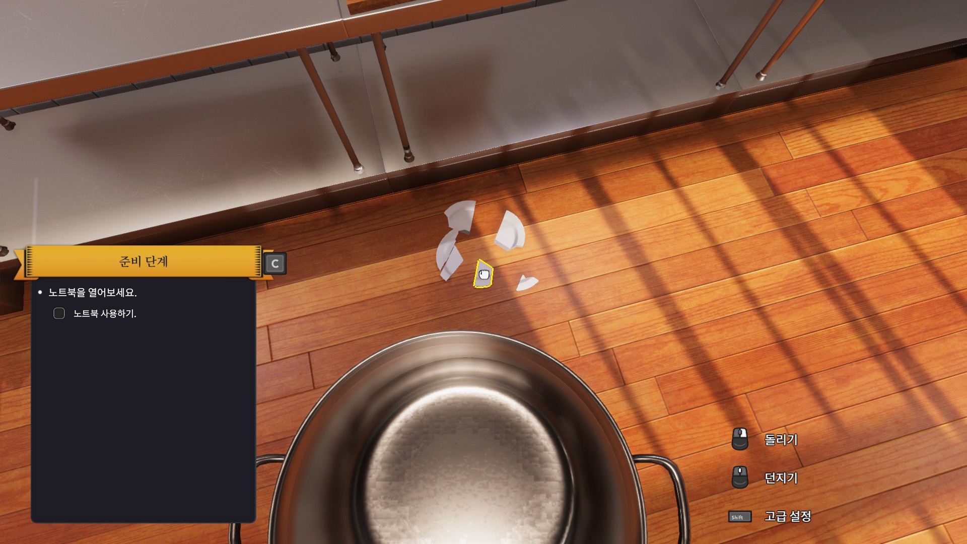 사고나면 좀 더 편하게 쓰라며 이렇게 주방쪽으로 옮기라는 퀘스트를 줍니다. 상자를 바라보며 e버튼을 누르면 되니 난이도는 아주 쉽습니다. 그리고 나면 왼쪽 아래에 보이는 리스트에 있는 기구들을 모두 구입하라는데 뭔놈의 주방에 이런 기본적인것도없는건지 이거 제가 봤을때는 전에 일하던 주방장놈이 가지고 튄거같습니다.