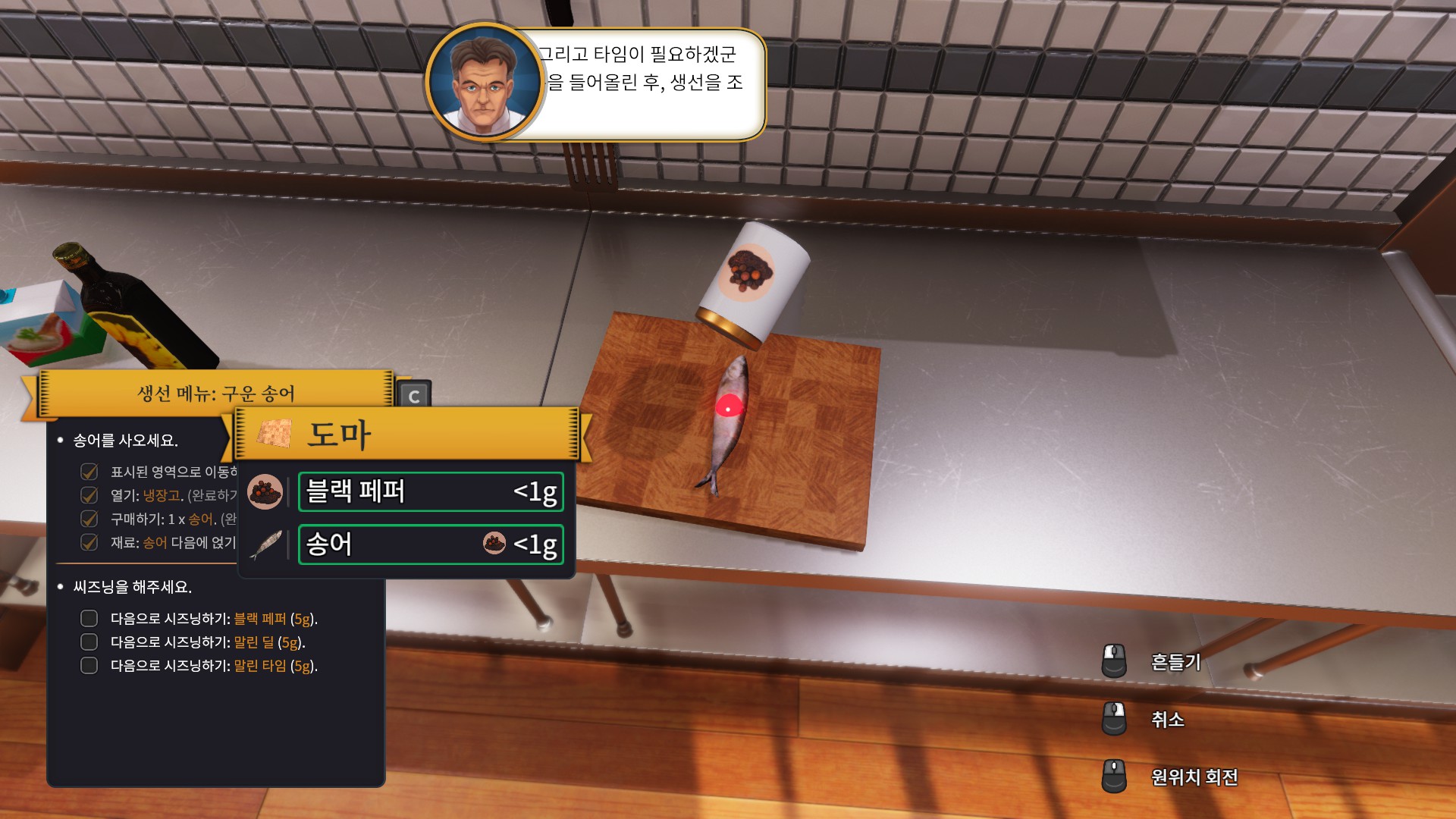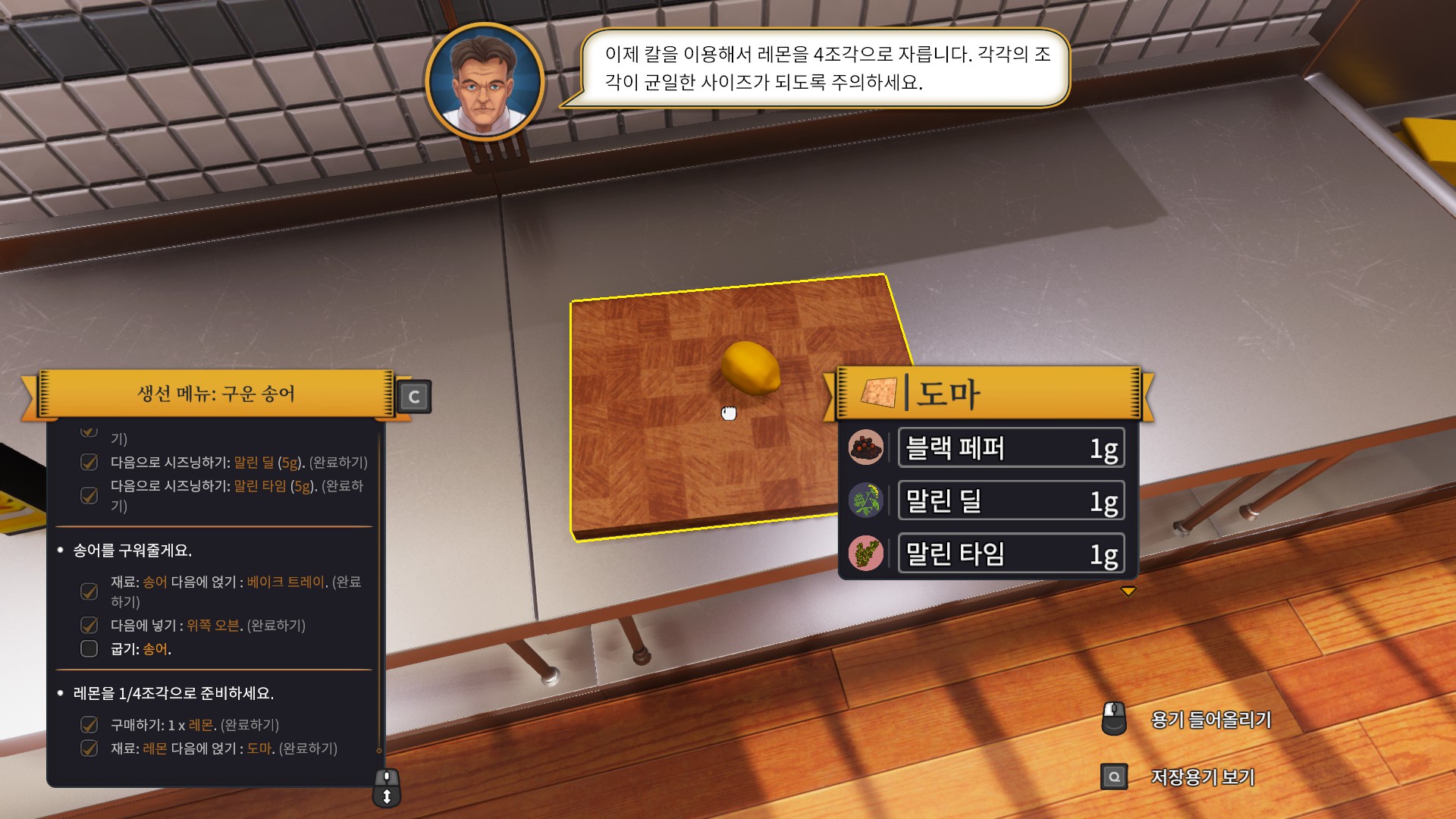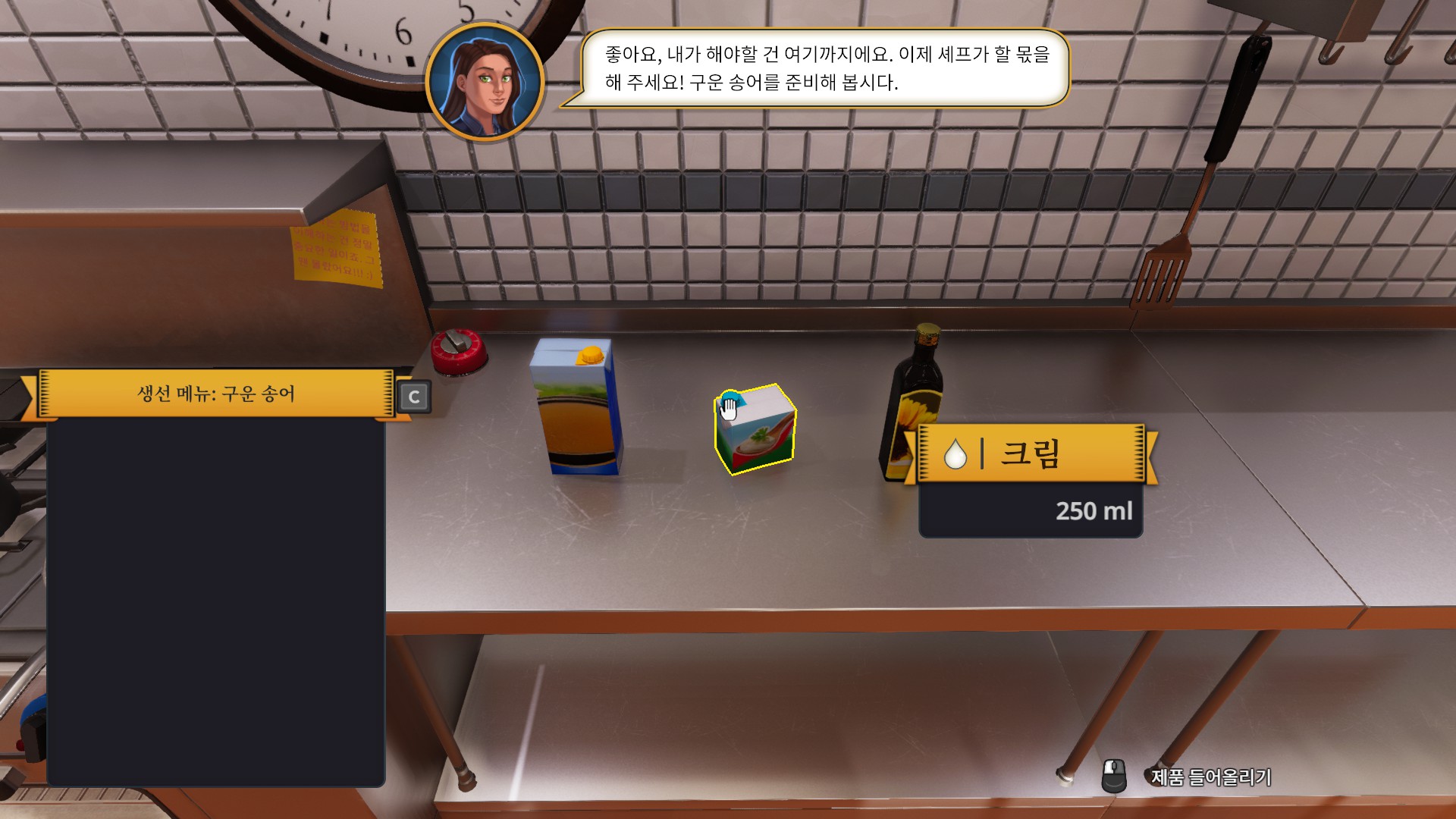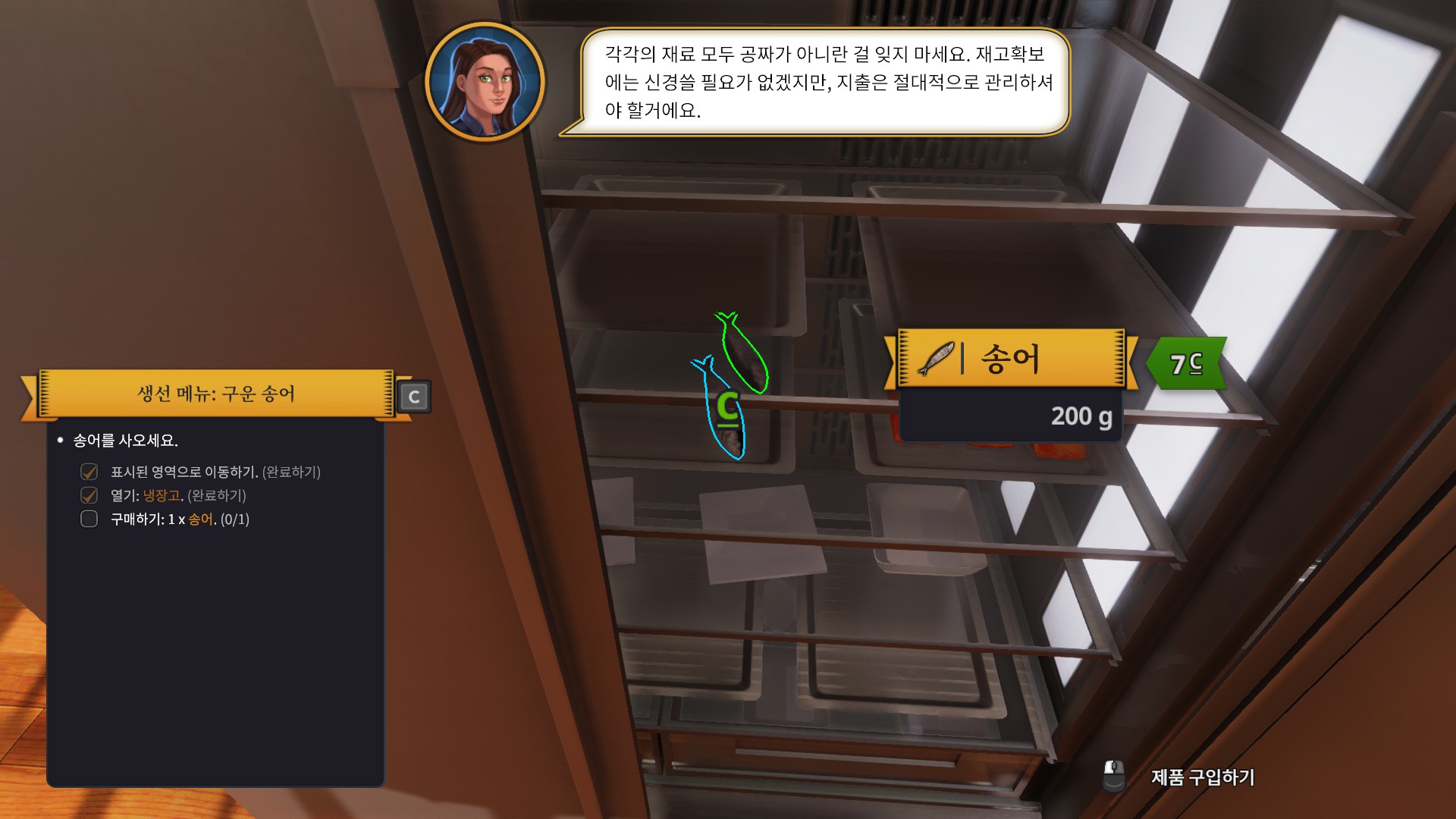 처음으로 받은 주문은 바로 송어 구이입니다. 튜토리얼이라서 그런지 엄청나게 친절하게 냉장고로 가라고 명령까지 해주네요.