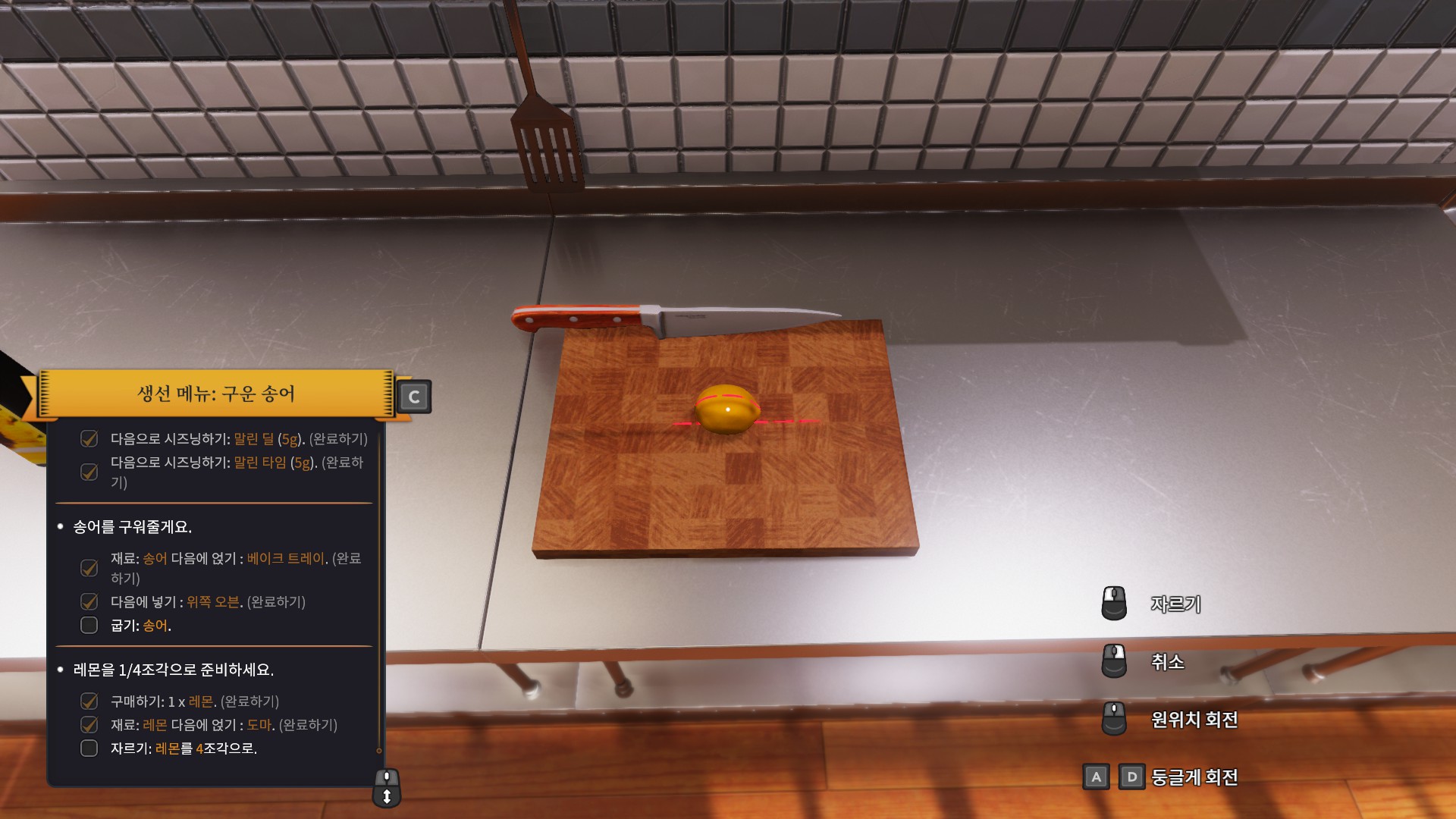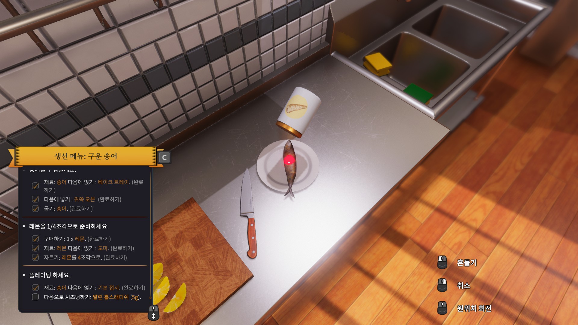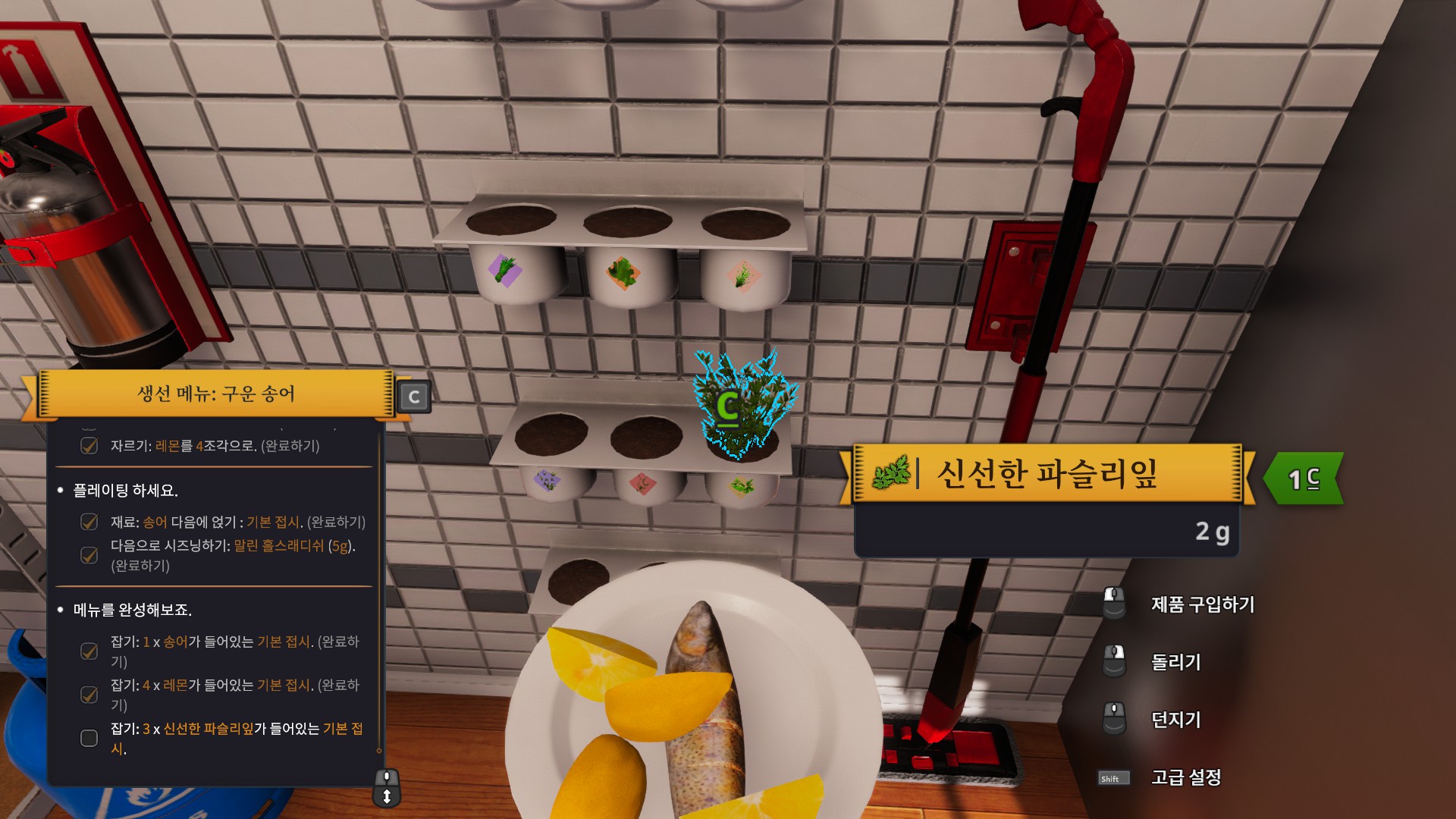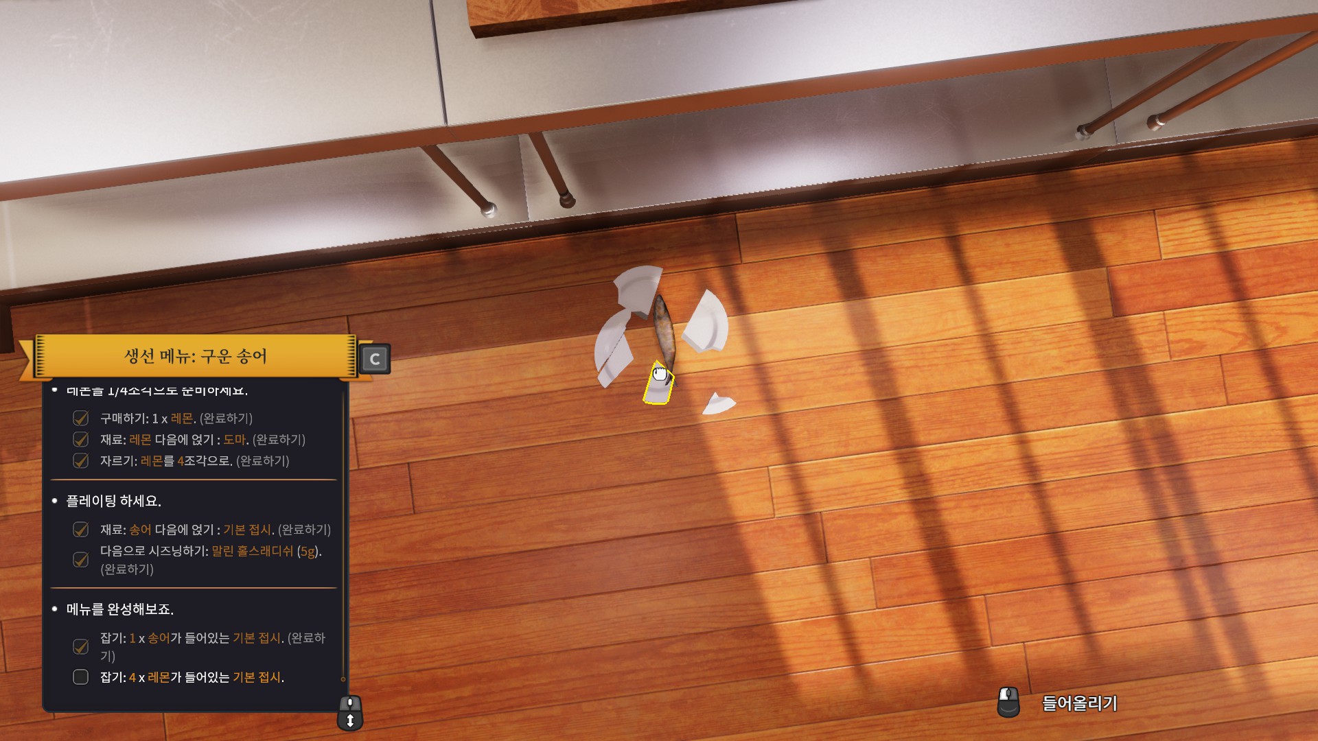 처음으로 받은 주문은 바로 송어 구이입니다. 튜토리얼이라서 그런지 엄청나게 친절하게 냉장고로 가라고 명령까지 해주네요.