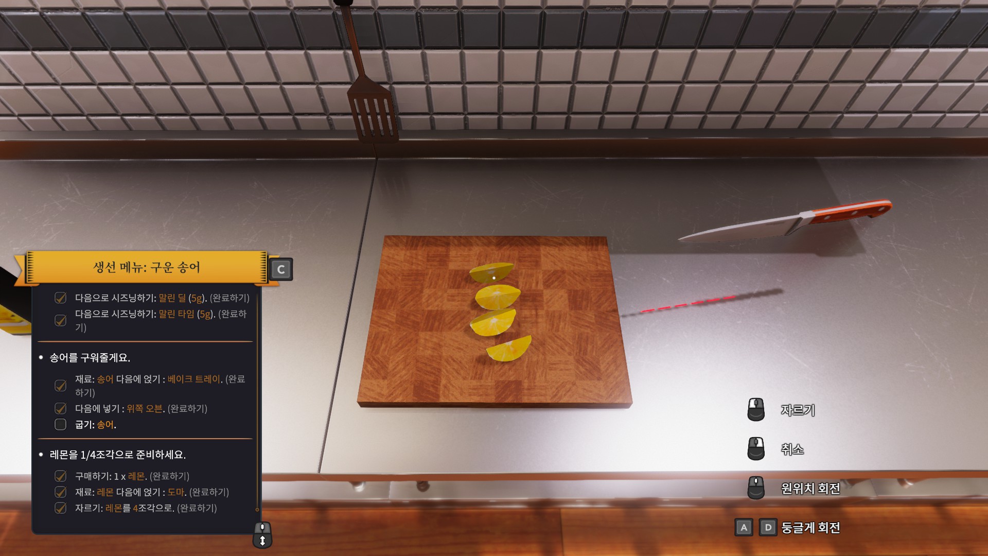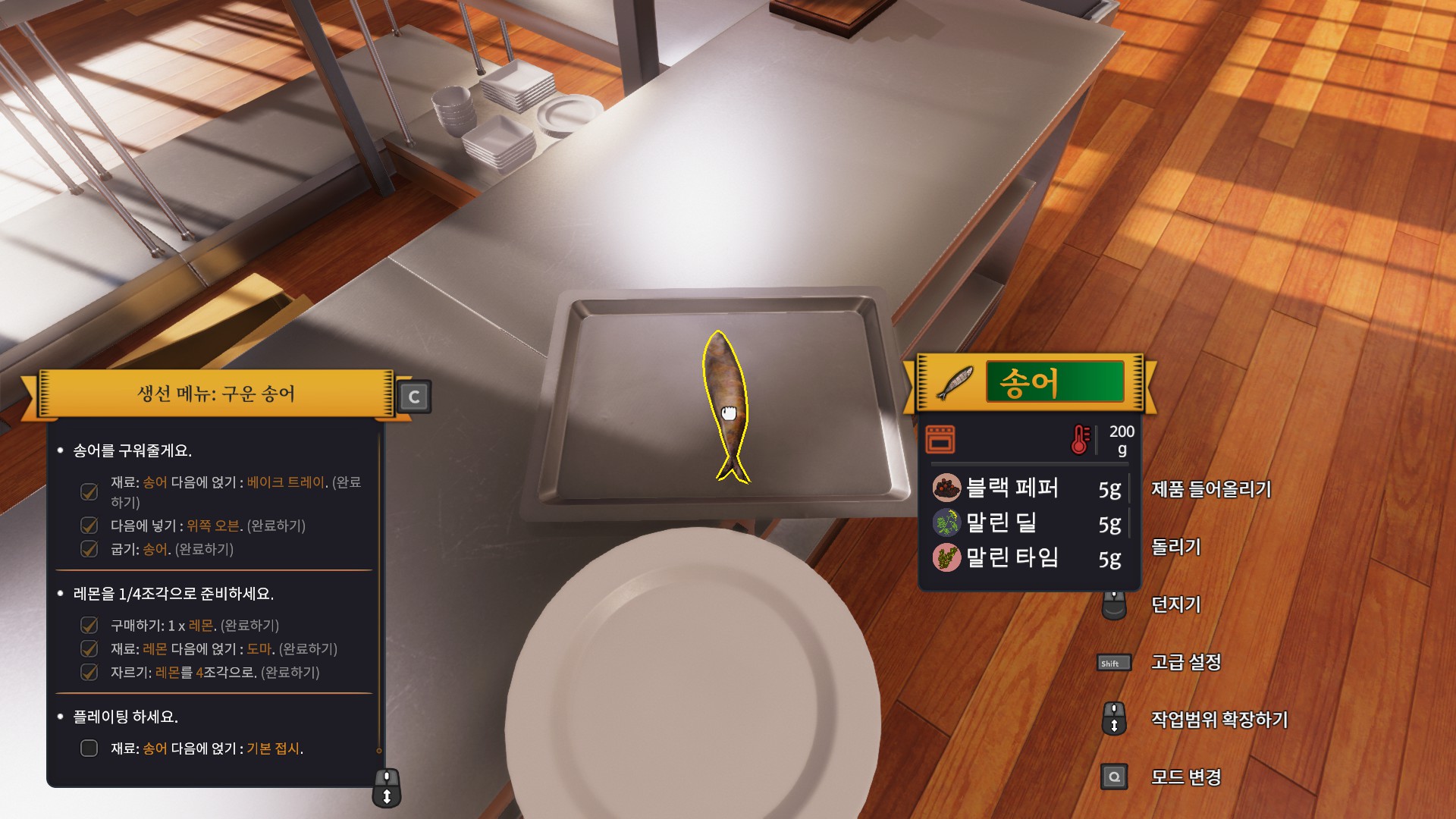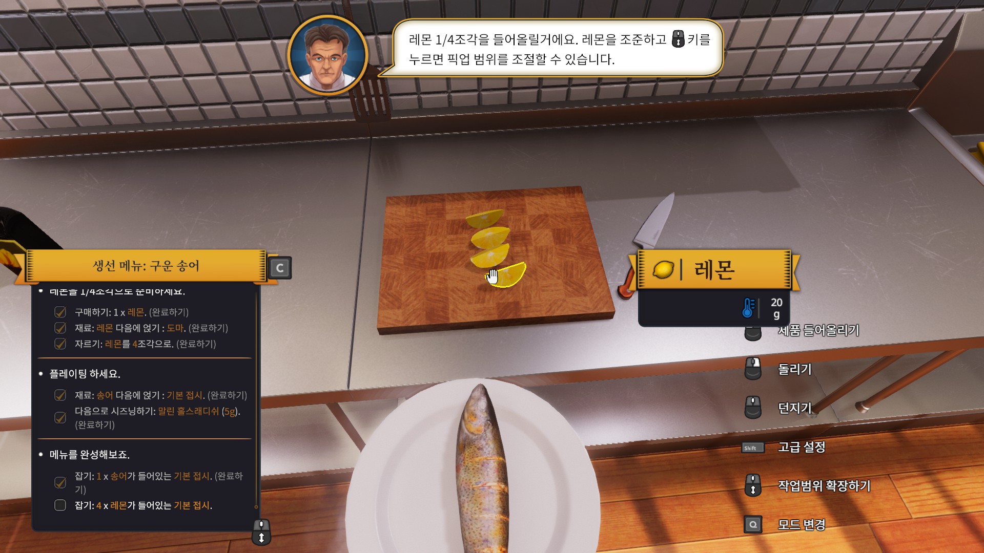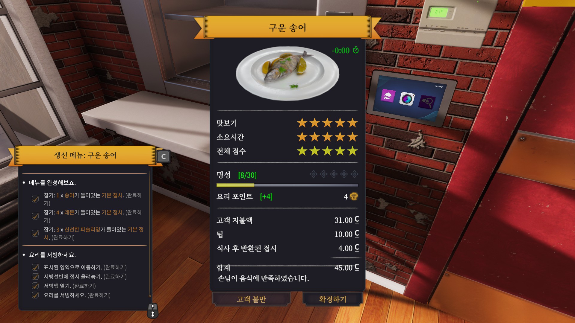 처음으로 받은 주문은 바로 송어 구이입니다. 튜토리얼이라서 그런지 엄청나게 친절하게 냉장고로 가라고 명령까지 해주네요.