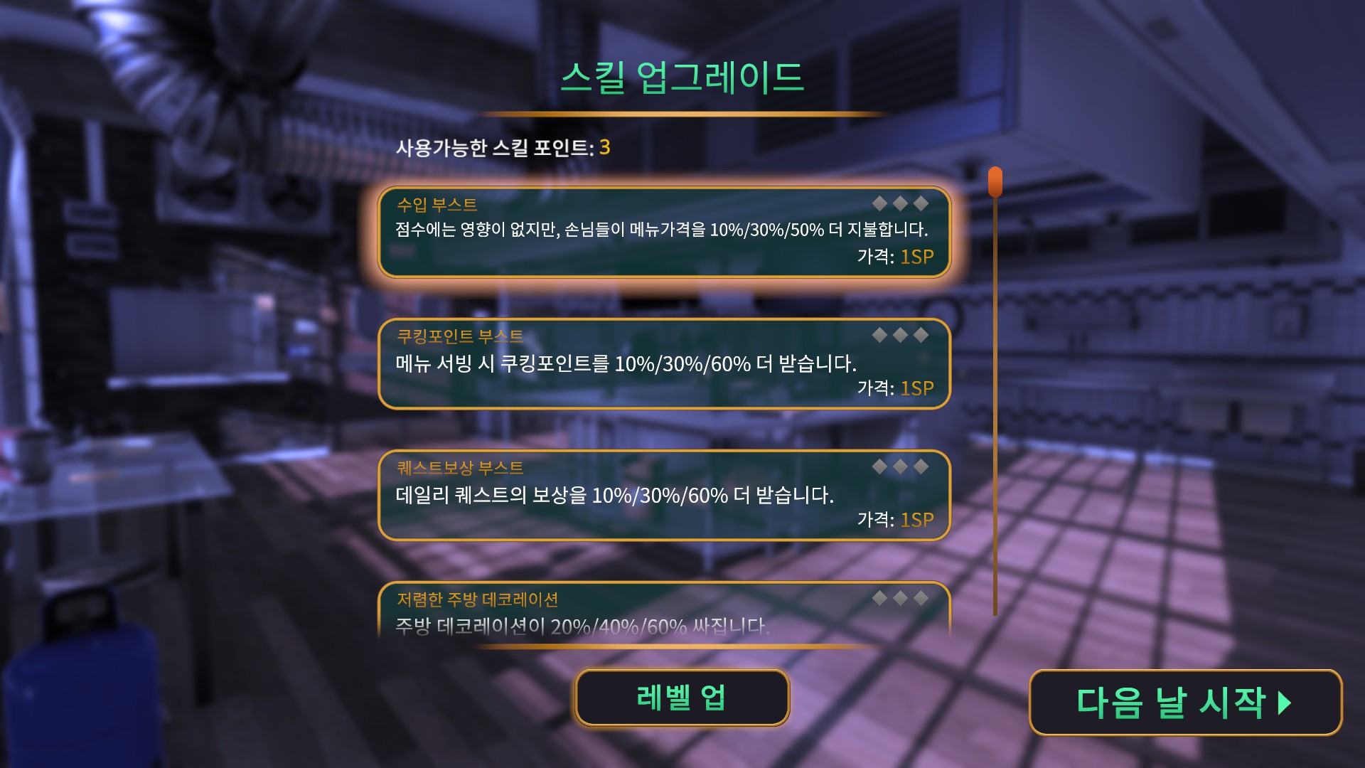 퍼크를 찍고나면 이렇게 레벨마다 스킬을 업그레이드할수있다는 안내를 해줍니다. 저는 얼른 돈을 벌고싶어서 첫번째에있는 수입 부스트만 두개 찍었습니다. 처음 1레벨을 올릴때는 1포인트만 요구하지만 당연하게도 레벨이 오를때마다 요구하는 포인트가 1씩늘어나니 참고하세요.