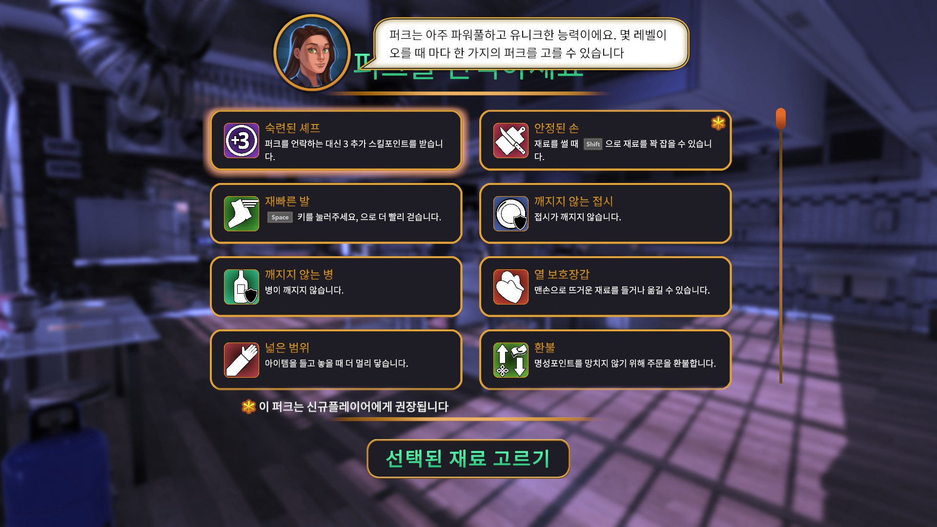 하루일과를 끝마치고나면 이렇게 일정레벨마다 퍼크를 고를 수 있게되는데 저는 열 보호장갑을 구입했습니다. 맨손으로 뜨거운거 못잡는게 은근히 스트레스더라구요.