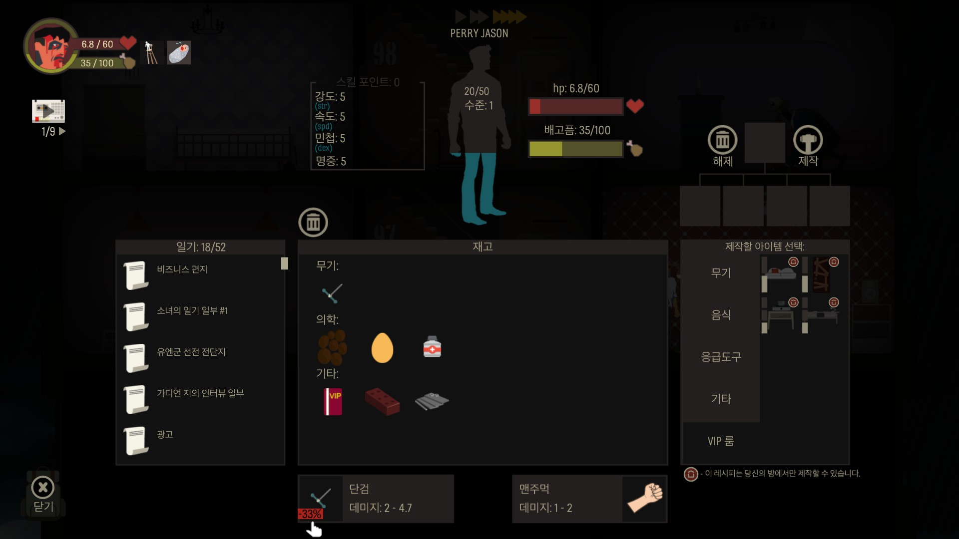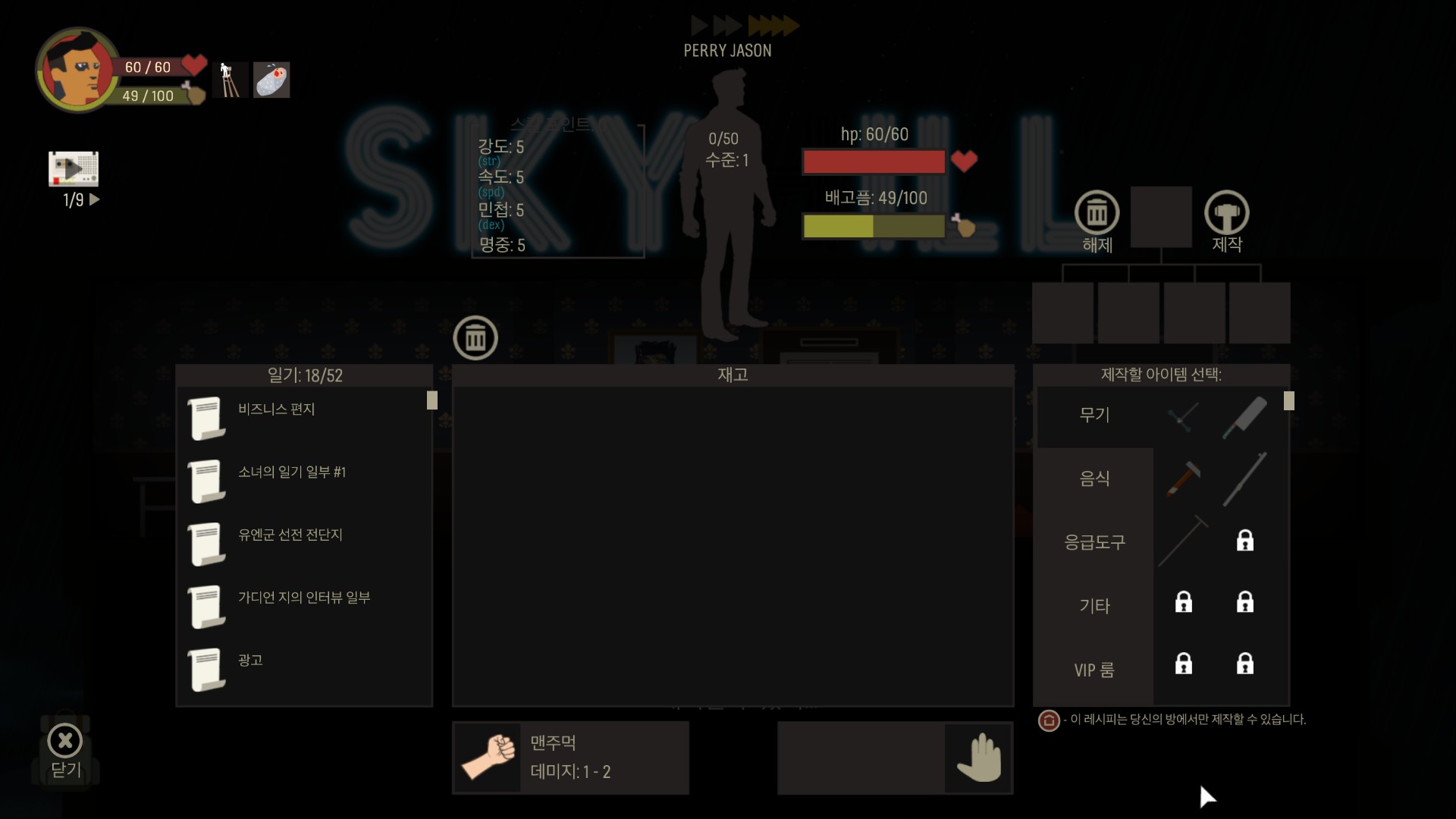 시작할 때 피는 원래 100이지만 저는 고소공포증 스킬을 찍었기때문에 60으로 시작합니다.