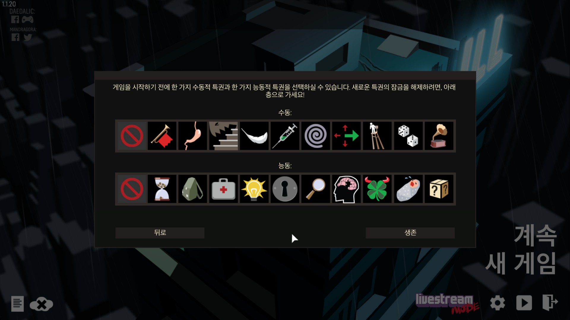 난이도를 선택하게 되면 수동적 특권과 능동적 특권을 한 가지씩 선택할 수 있게 되는데