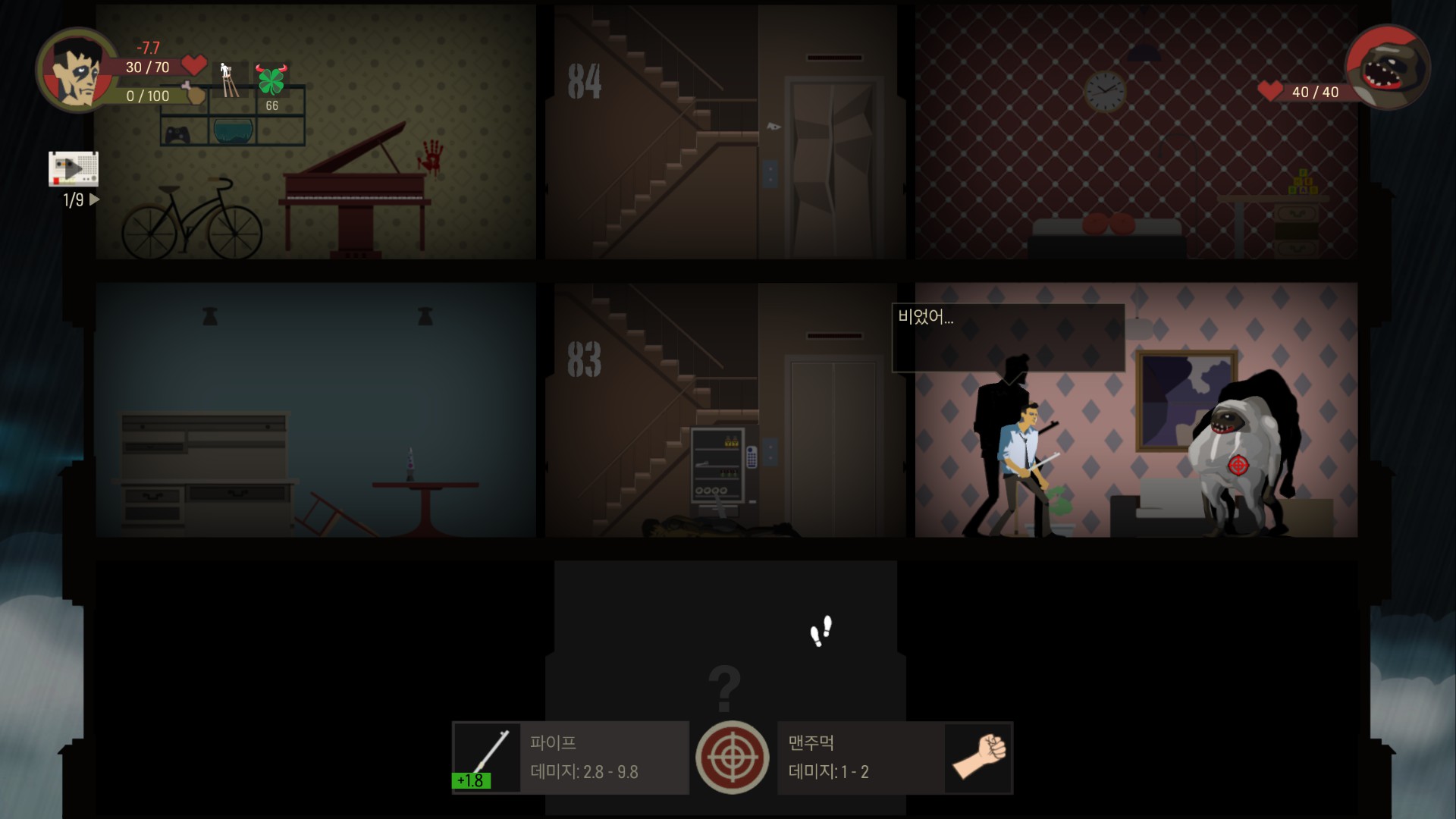 여기서는 전투가 정말 중요한데 방에서 일어나는 전투는 스킵이 가능하지만