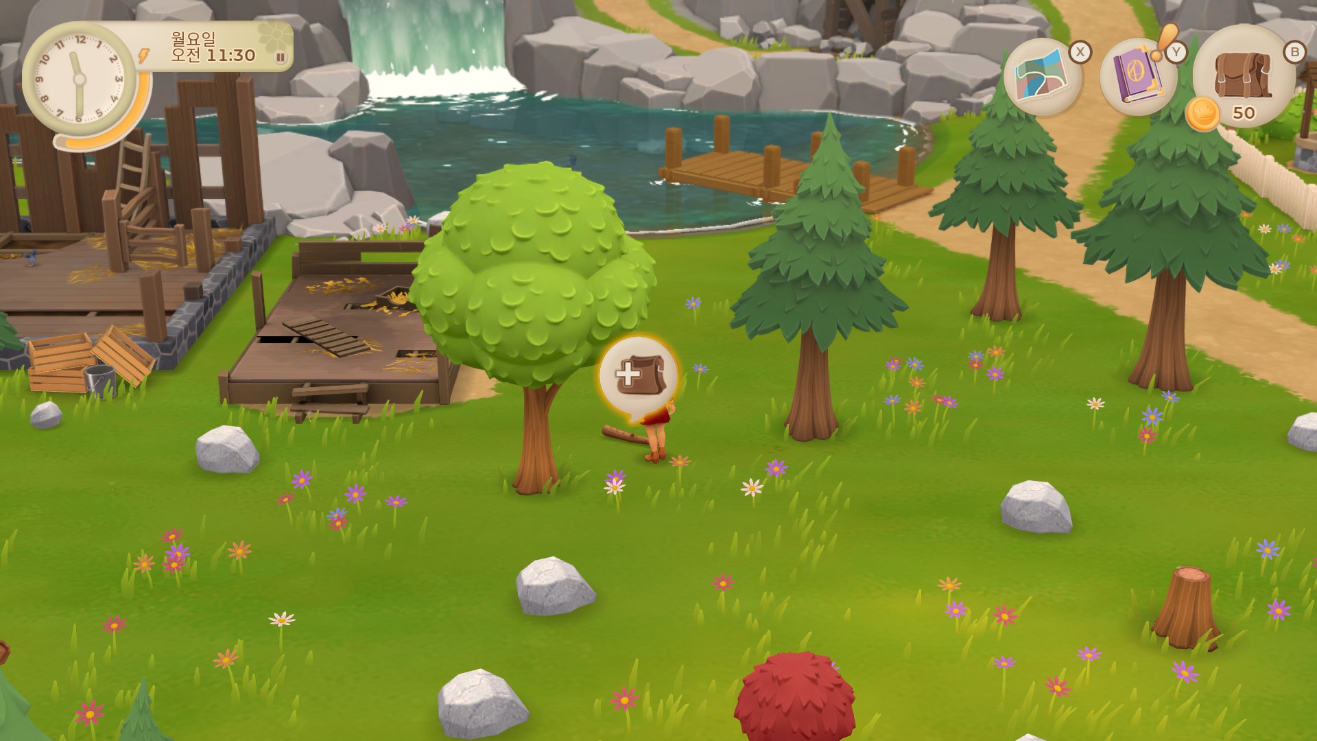 나무와 잡초는 매우 중요하기에 눈에 보이는 족족 파밍하시길 바랍니다. 와일드 플라워즈 플레이 시 조금 불편한 점 중 하나가 바로 파밍이 가능한 재료를 육안으로 쉽게 구분하기 힘들다는 것인데요. 헷갈린다면 가까이 다가간 후 위 사진과 같은 아이콘이 표시되면 파밍이 가능한 재료이니 참고하시길 바랍니다.