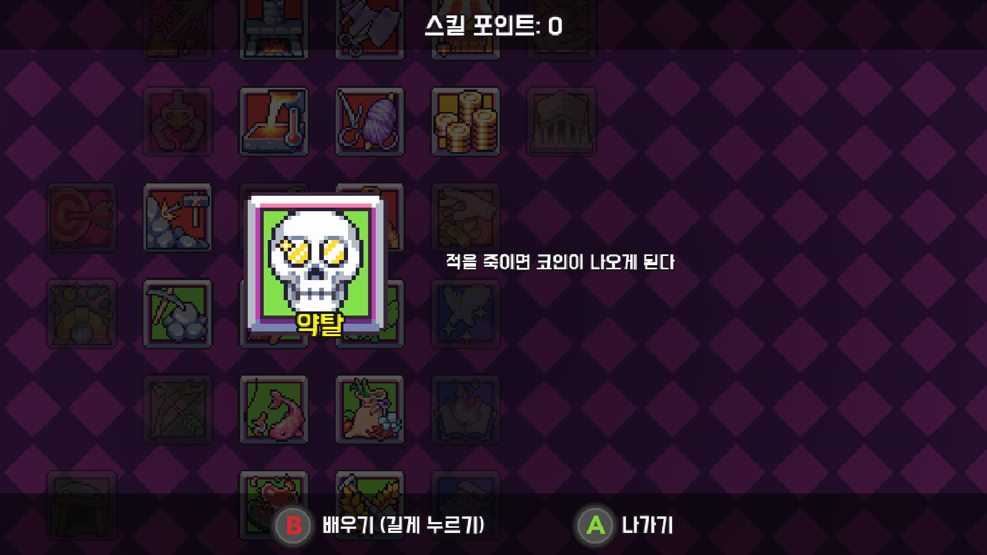드디어 적을 죽이면 코인이 나오게 되는 약탈 스킬도 찍게 되었습니다. 슬슬 rpg게임의 냄새가 나기 시작하네요. 실험을 해본 결과 슬라임의 경우 죽였을 때 4코인을 드랍합니다. 몬스터마다 다른지는 모르겠지만 아마 비슷비슷할거같아요. 하지만 적을 죽였을때 템뿐만 아니라 초반에 굉장히 많이 부족한 코인을 수급할 수 있는 건 분명히 매력적인 요소이니 반드시 찍어주시는 게 좋을 것 같습니다.