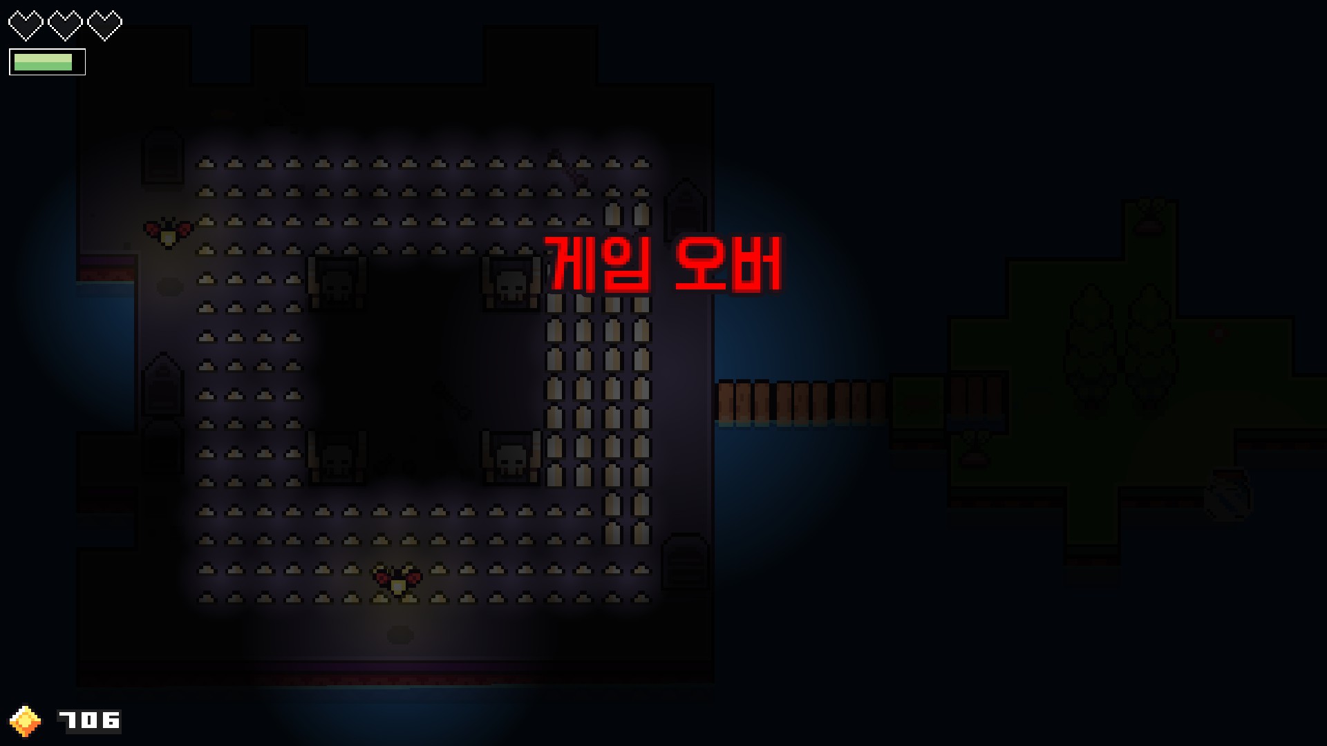 첫날 제가 죽어본다고는 했는데 결코 이런 방식을 원한 건 아니었어요... 정말 심장이 내려앉는듯했습니다. 불행 중 다행인 것은 죽었을 때 템을 떨어트리는 것이 아니라 그냥 마지막 자동 저장 지점에서 다시 시작하는 것인데 문제는 정말 기분이 더럽습니다. 일단 근처에 가게 되면 저 돌멩이 같은 게 가시를 세우며 오지 말라고 울타리를 쳐내는데 저의 머리로는 도저히 통과해낼 방법을 아직 찾지 못하였습니다. 혹시 다리를 설치하고 건너야 하는 건지 가시가 올라오기 전에 빨리 가면 되는 건 아닌지 별짓을 다해봤는데 계속 죽기만 하더군요. 활 같은 걸 해금해서 다시 한번 도전해봐야겠습니다.