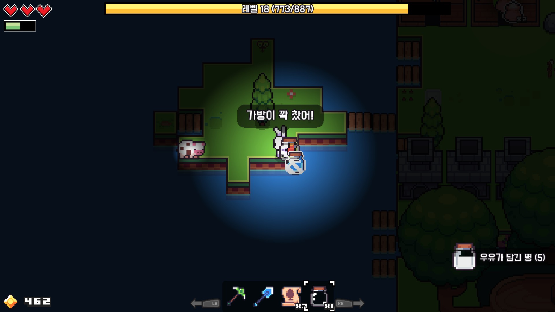그리고 또 새로운 사실을 발견했습니다. 저기 있는 젖소에게서 우유를 채취하다 실수로 바닷물을 눌렀더니 세상에 물이 담긴 병이 되는 거 아니겠어요. 이걸로는 나중에 뭘 하게 될지는 모르겠지만 템창이 없는 관계로 방치해두도록 하겠습니다.
