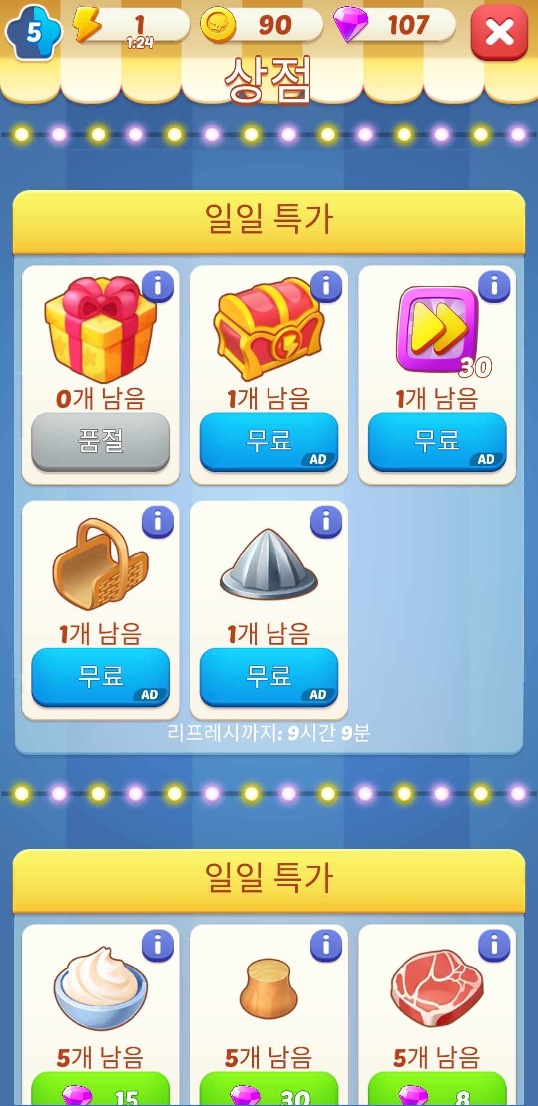 여러 머지 게임을 플레이하면서 일일 퀘스트와 같은 요소는 거의 못 본 것 같은데 신선하더라고요. 심지어 저 일일 특가도 보통 한 개나 두 개 정도의 보상을 무료로 뿌리고 나머지는 캐시를 사용해야 하는데 이 정도면 꽤 혜자라고 볼 수 있을 것 같습니다.