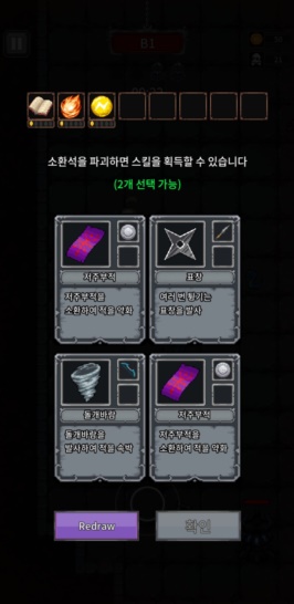 참고로 스킬을 획득할 때 하나를 골랐다가 옆에 있는 걸로 바꾸고 싶어서 터치하면 곧바로 변경되지 않습니다. 다시 터치해서 취소한 후 다른 걸 선택해야 한다는 점이 매우 번거롭습니다.