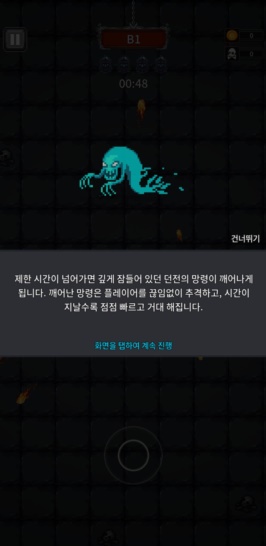 만약 제한 시간이 넘어간다면 망령이 깨어나 플레이어를 끊임없이 추격하며 시간이 지날수록 커지고 빨라집니다. 뱀서 클리어했을 때 등장하는 사신이랑 비슷한 것 같습니다.