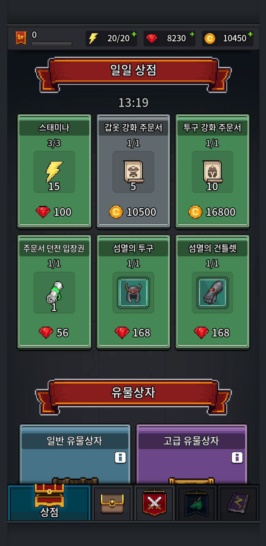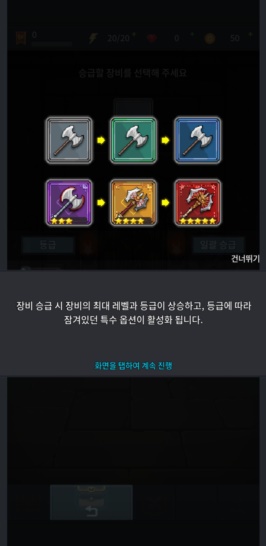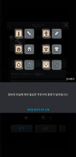 튜토리얼의 난이도가 아닌 것 같은 첫판을 끝내고 나면 장비를 획득하게 됩니다. 장비는 주문서와 골드를 소모해 강화할 수 있으며 타입에 따라 필요한 주문서의 종류가 달라지니 참고하세요.