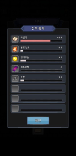 그래도 이 게임의 가장 큰 장점이 바로 끝나면 이렇게 딜량이 표시된다는 점이었습니다. 어떤 스킬이 가장 많은 딜을 넣었고 어떤 스킬이 적은 딜을 넣었는지 한눈에 확인할 수 있어 마음에 들었습니다.
