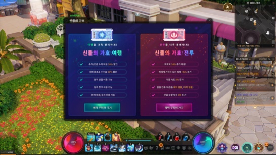 신들의 가호는 여행과 전투로 나누어져 있으며 각각 다른 혜택을 제공하고 있습니다.