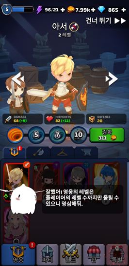 동반자는 하단의 파티 탭을 터치해 관리하거나 강화할 수 있는데요. 각자의 역할과 능력치가 존재하기 때문에 설명을 잘 읽어보고 구성하시길 바랍니다.